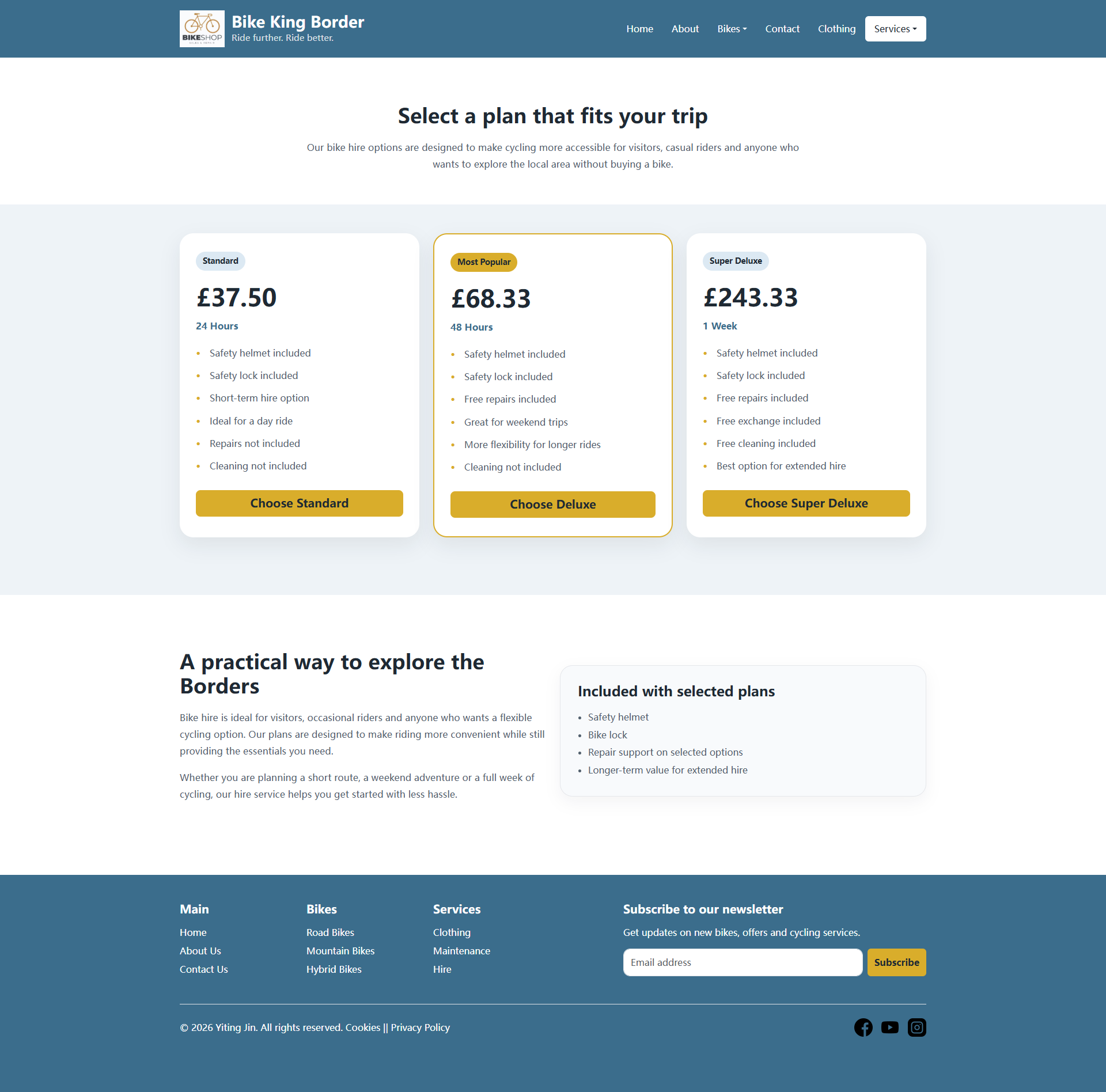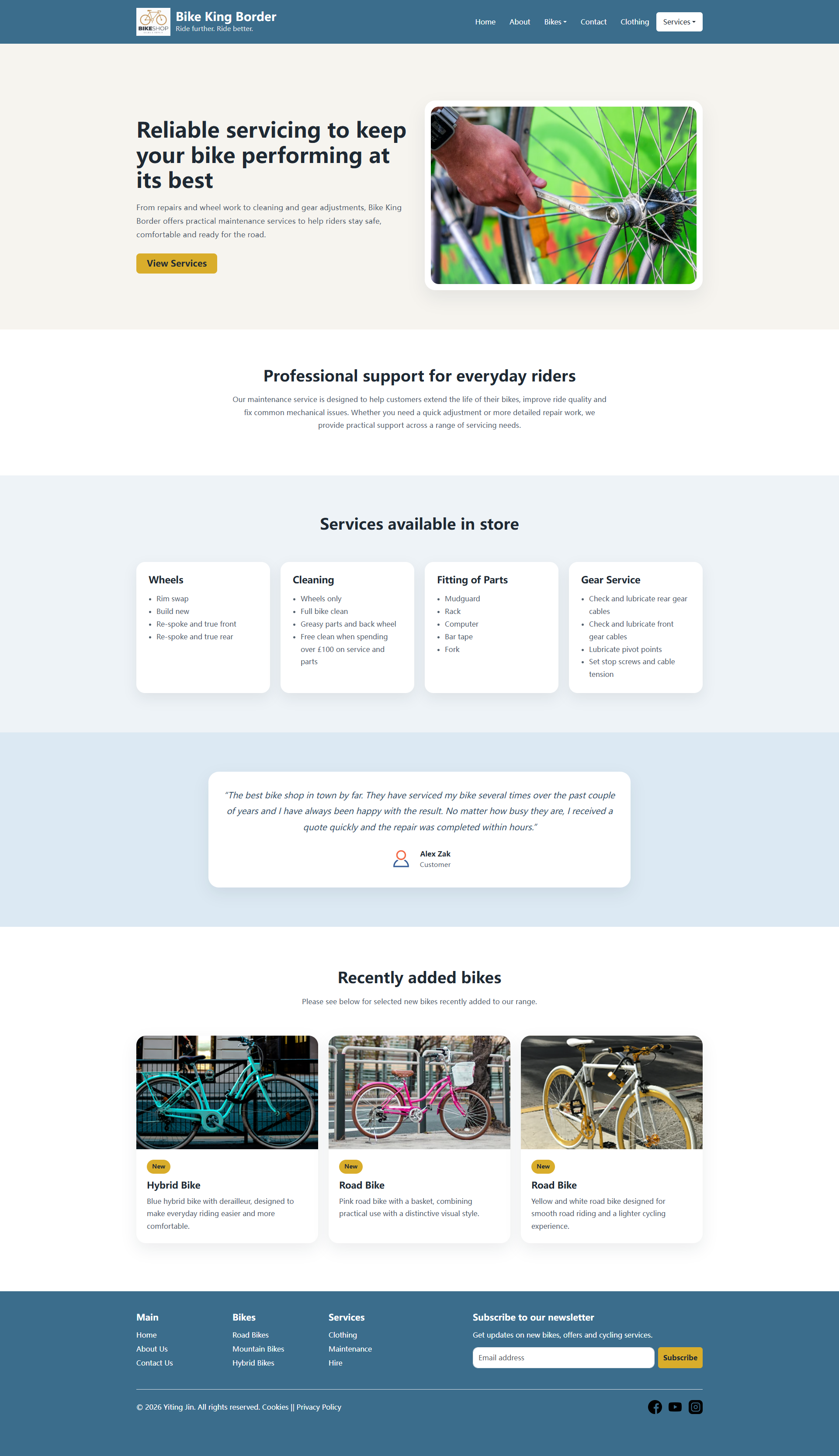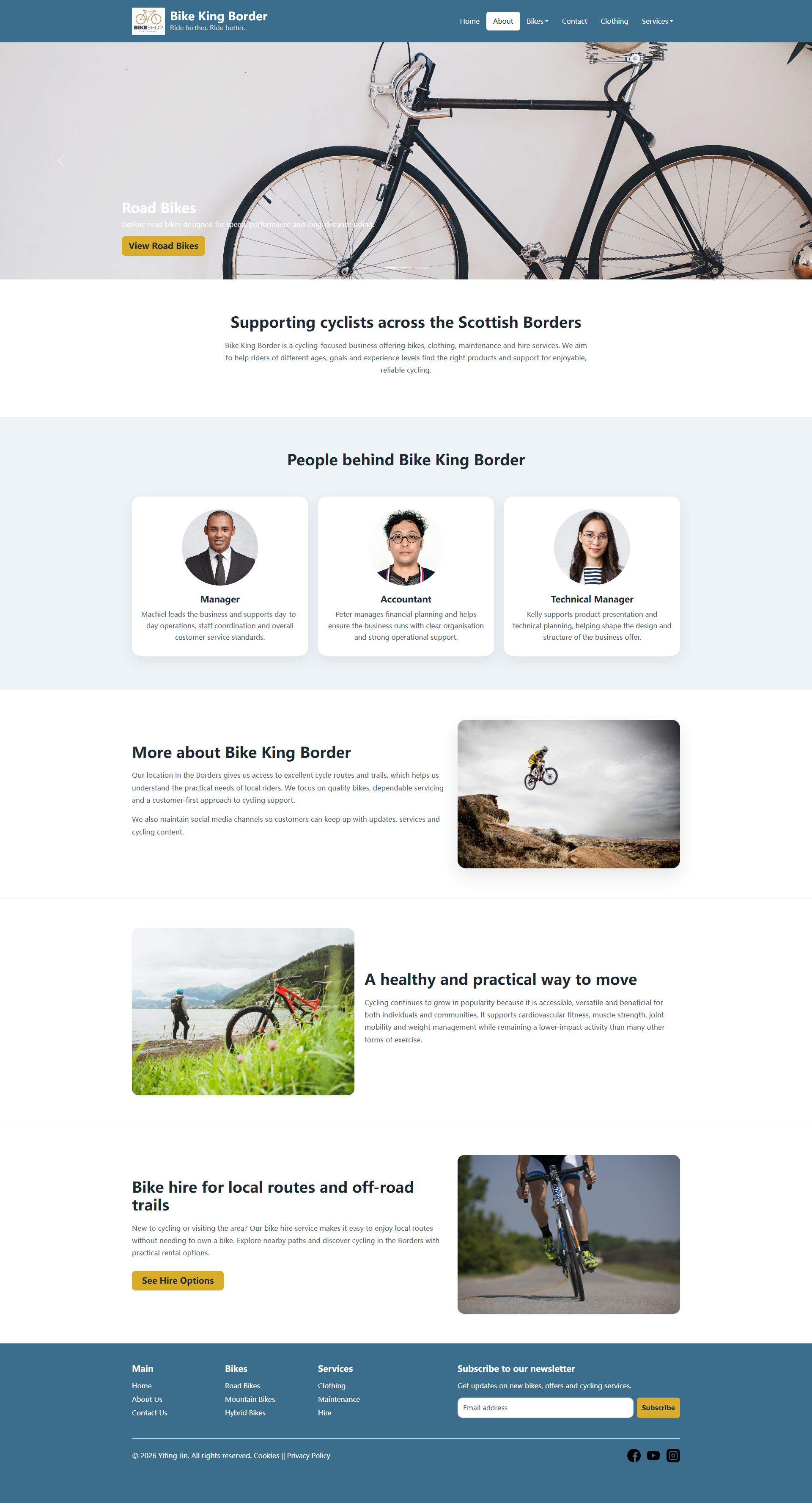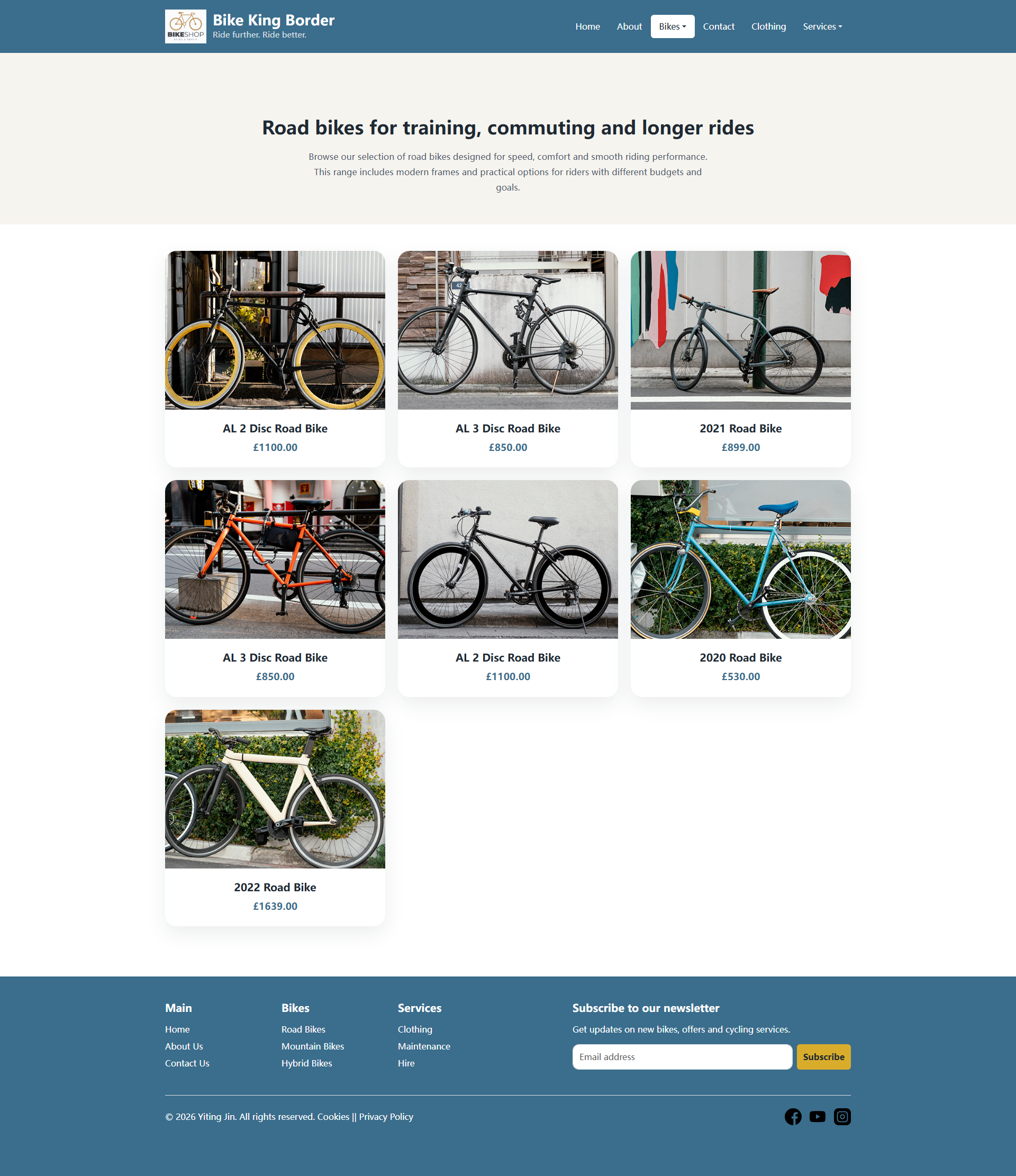 The purpose of this redesign was to build on the foundation of my original bike website and reflect the progress I have made in front-end development. The website allows users to explore bicycles, accessories and services through a clearer page structure and a more engaging browsing experience.