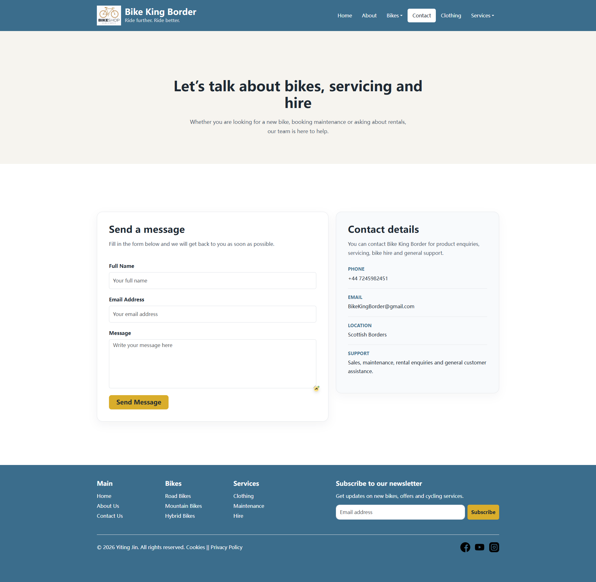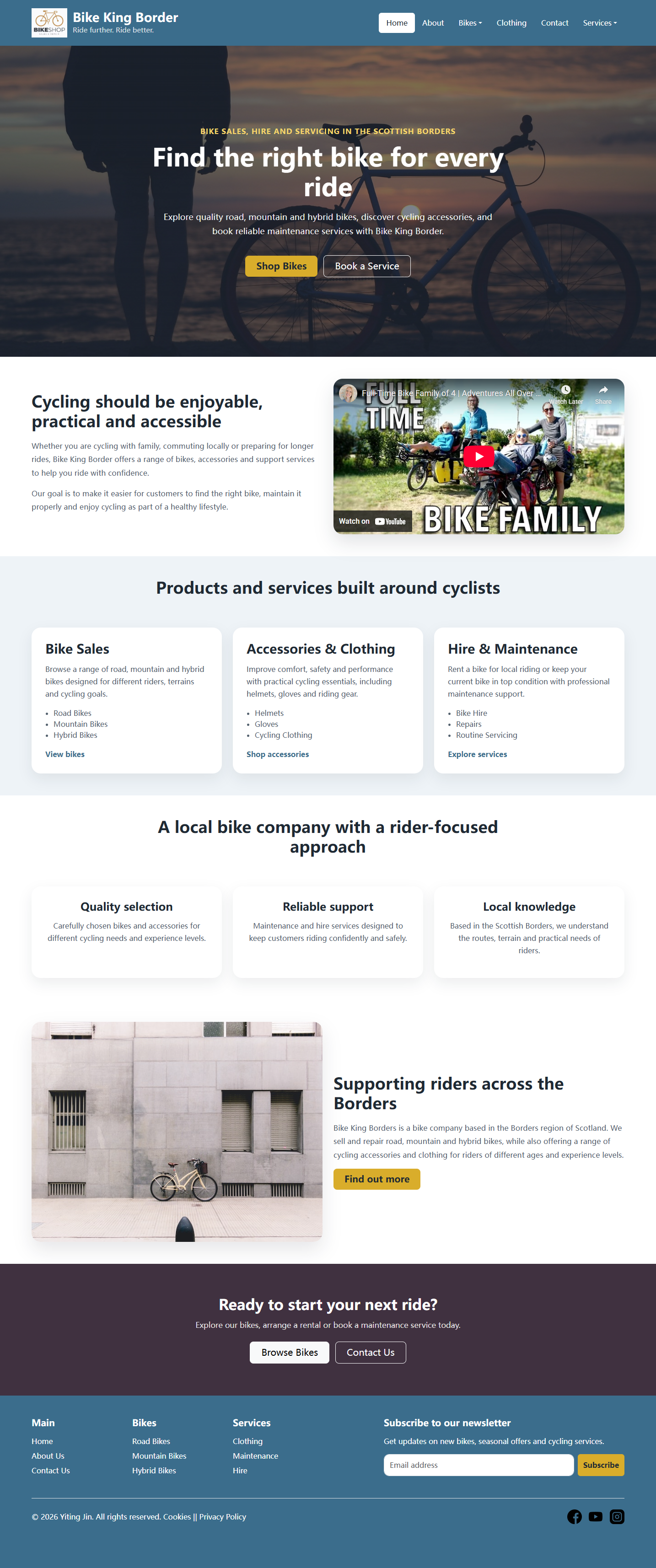 The purpose of this redesign was to build on the foundation of my original bike website and reflect the progress I have made in front-end development. The website allows users to explore bicycles, accessories and services through a clearer page structure and a more engaging browsing experience.